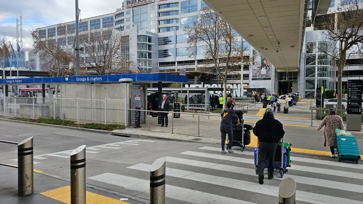 Head to the cross walk, cross the road, turn LEFT, and keep heading towards the blue ‘Groups and Charter zone’