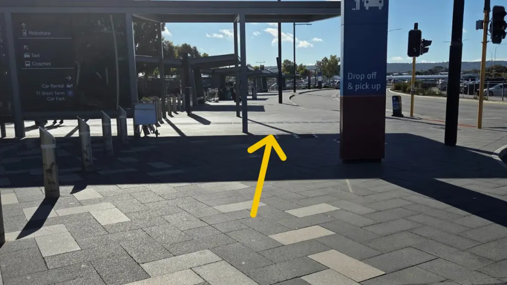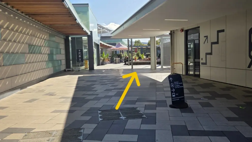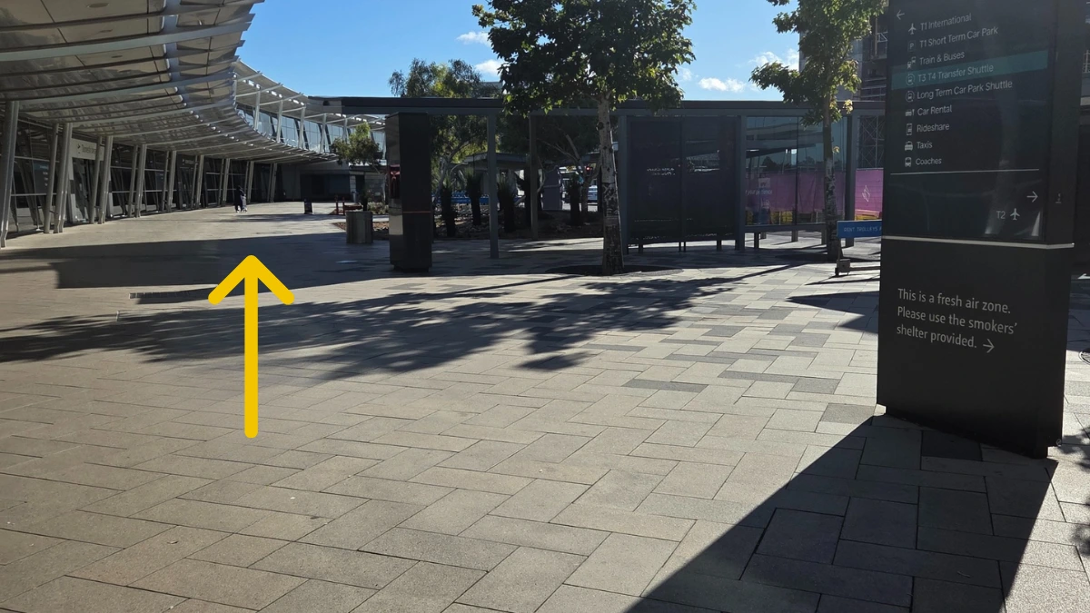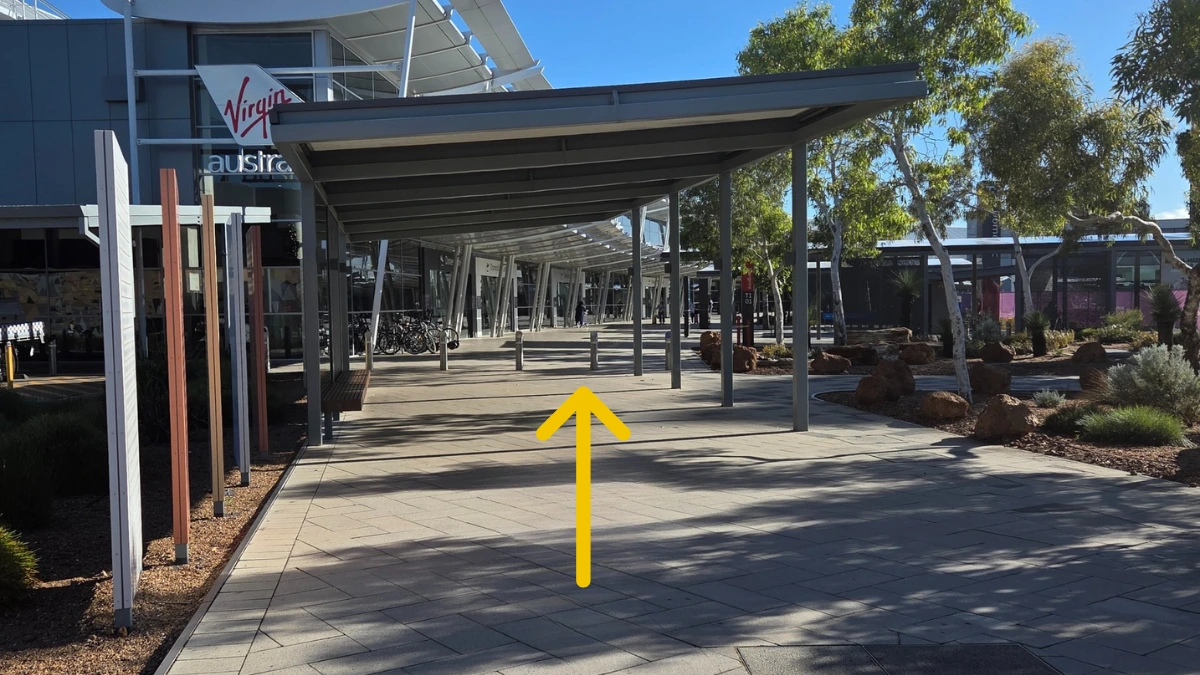 Walk past the Virgin Australia building entrance, keeping under the shade structure as the walkway continues.
