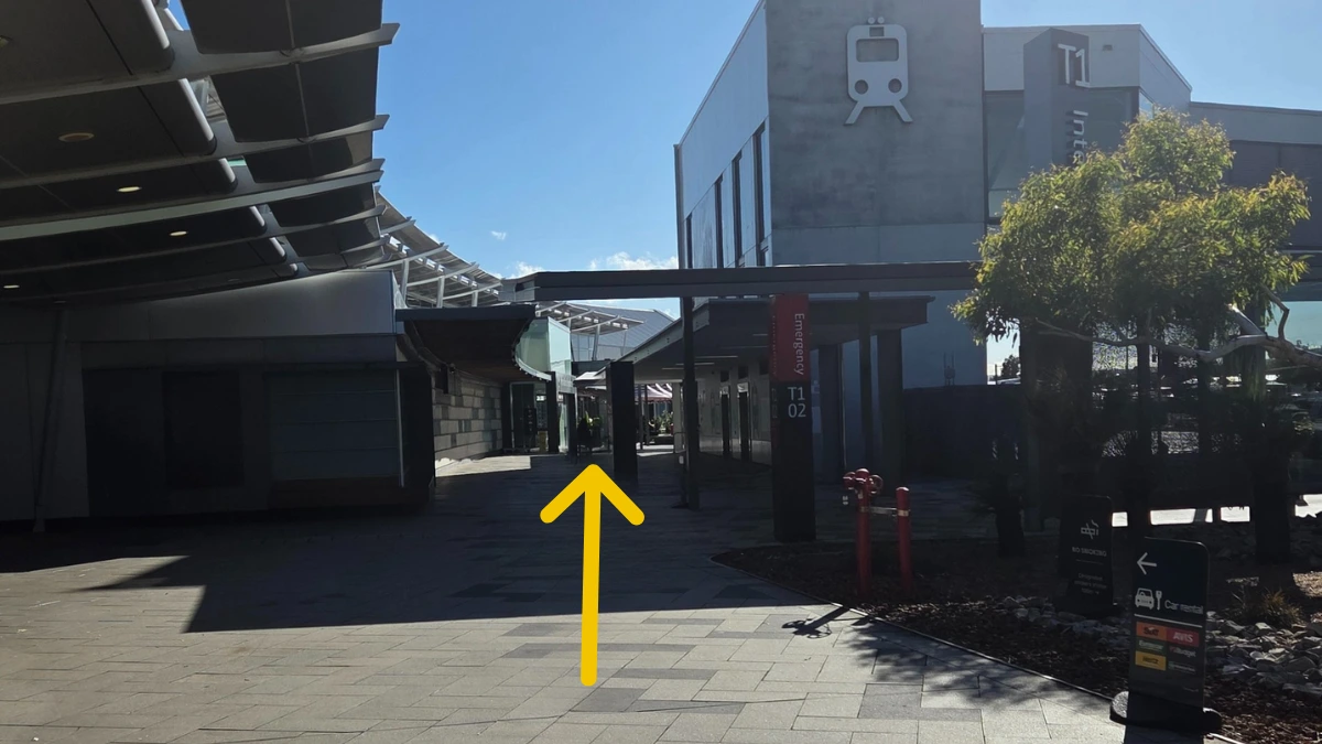 Continue following the same walkway through and past the Terminal 1 train station entrance until you reach the bollards on the right.