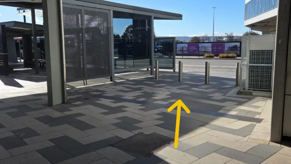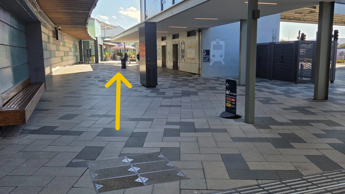 Keep walking through the sheltered area toward the main bus zone and train terminal. Stay on the footpath closest to the terminal.